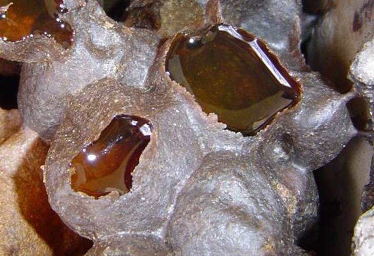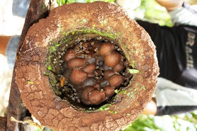 | Al retirarse la tapa construida por tierra, hojas, barro y cera así se ve el interior del hobon con los respectivos panales que continene la miel. A diferencia del panal externo de otras variedades de abeja, la forma del panal es más irregular y la cera que las abejas producen para su producción es de una tonalidad más oscura por el contacto con la madera y el tipo de vegetación peninsular. |