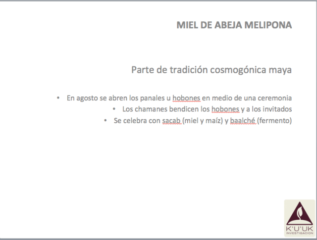 | La abeja melipona se diferencia del resto de las familias de abejas porque carece de aguijón y su tamaño es ligeramente menor que el de las africanas o europeas. Por estas características, es sensible a la invasión de otras especies, a animals superiores o infestaciones de otros insectos, además que es de caracter pacífico y poco territorial. Como resultado, los mayas la nombraban Señora de la Miel, cuyo dios protector era Ah Musen Cab. |