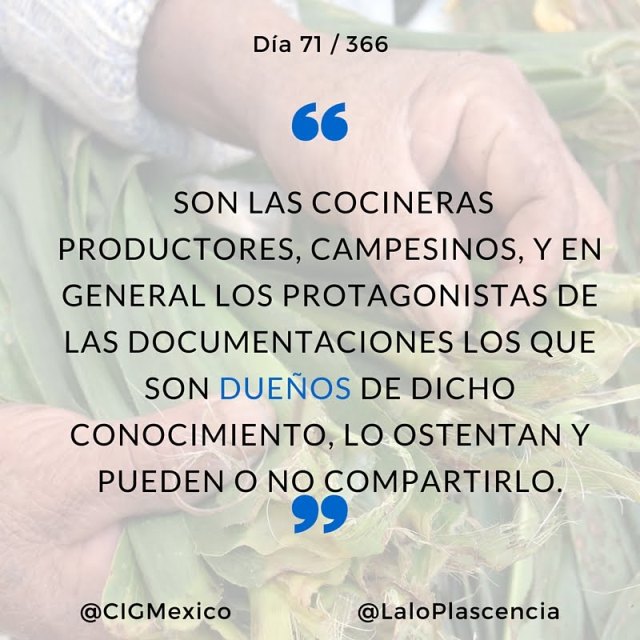 EJEMPLO: una cocinera tradicional abre las puertas de su casa para compartir recetas y técnicas ancestrales de su localidad. El investigador tiene la obligación de documentar con diversidad de recursos audiovisuales para después analizar dicha información, ordenarla y codificarla para compartirla por distintos medios. Después de todo el proceso analítico, codificador y comunicador del investigador ¿quién es dueño del conocimiento?. La respuesta es sencilla: sigue siendo la cocinera tradicional, el investigador es el medio, no el fin.