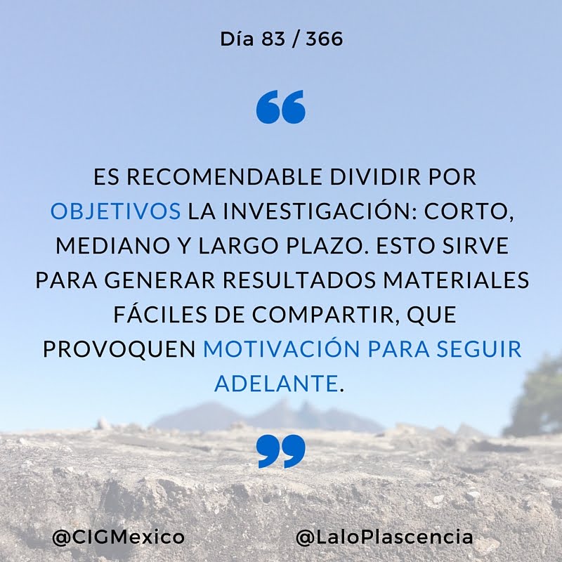 Por ello, es recomendable dividir por objetivos la investigación: corto, mediano y largo plazo. Esto sirve para generar resultados materiales fáciles de compartir, que provoquen motivación para seguir adelante, y recuerden que la investigación es un camino en donde la posibilidad de renuncia es inevitable pero con la total vocación y las metas sólidas y claras, claudicar no es opción.