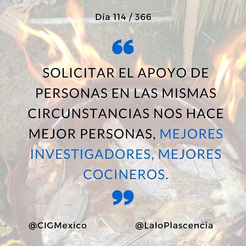 Pero sobre todo, cuando las cosas en la investigación se complican demás, o se vuelve más difícil hacerlas sin renunciar, lo más importante es que se debe pedir ayuda. Un poco de guía de aquellos con otras experiencias, un poco de luz de quienes tal vez ya pasaron por lo mismo. Solicitar el apoyo de personas en las mismas circunstancias nos hace mejor personas, mejores investigadores, mejores cocineros.