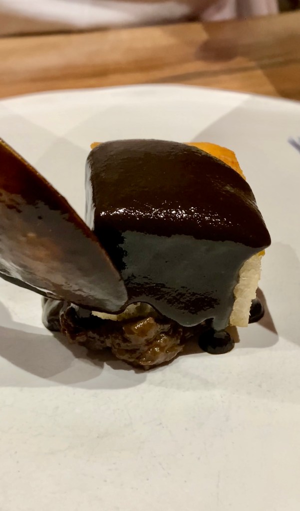 10 años después, con cambios de residencias trasatlánticos, viajes de visita a México, crecimientos individuales y grupales únicos, me senté en la barra de Vandelvira. Un privilegio presenciar la libertad en su máxima expresión. Fui convidado de la versión de Mole, una interpretación libre que condensa el largo camino de aprendizajes de Juan Carlos en un plato que no es de ningún lado pero es de todos. Como el mole tradicional que resume 1200 años de historia del mundo Occidental, su versión refleja a Oaxaca y Baeza, a Vandelvira y las casas oaxaqueñas, a los chilhuacles, pasillas y mulatos, y a las morcillas de matanza, y probablemente a mis abuelas y a las suyas. Es todo y es nada porque es cocina mexicana y española, es oaxaqueño y baezano, y vuelve a empezar. Es el último plato salado del menú, y es un homenaje sin quererlo a los siglos de historia compartida entre España y América. Es un platazo en toda regla.