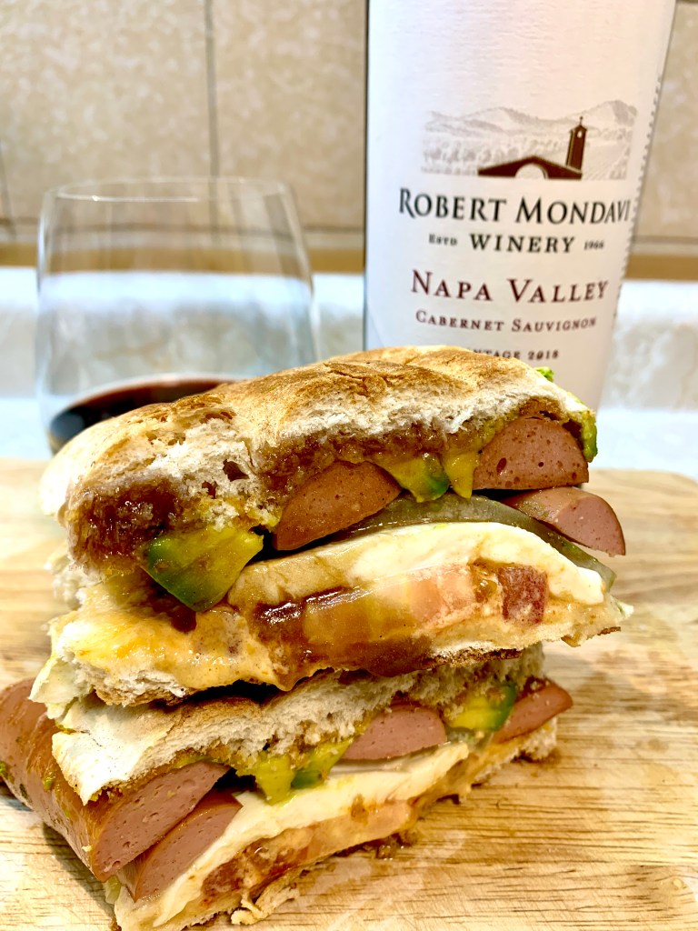 El vino en copa debe ser usado en el plato a maridar. Mi versión de torta de salchicha con pan de horno de leña, mayonesa casera de chipotle, quesos mozzarella y Comté, salchichas ahumadas y aguacate fue coronada con una vinagreta de Cabernet Sauvignon Vintage 2018 de Robert Mondavi Winery.
