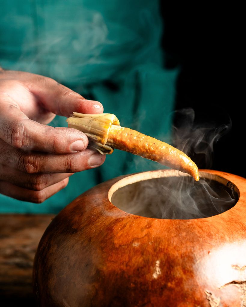 Para uno de los platos que serviría en el banquete se decidió por elotes en estado temprano de maduración sometidos a una suerte entre pibinal y brasas, para después pelarlos y servirlos con una mayonesa de castakán. Y obviamente Wilson tenía claro cómo ofrecerle la experiencia de ir directamente a la milpa, cortarlos de la planta y recibir una cátedra sobre el crecimiento del maíz, su costo de plantación y manutención, y la relevancia social del grano.