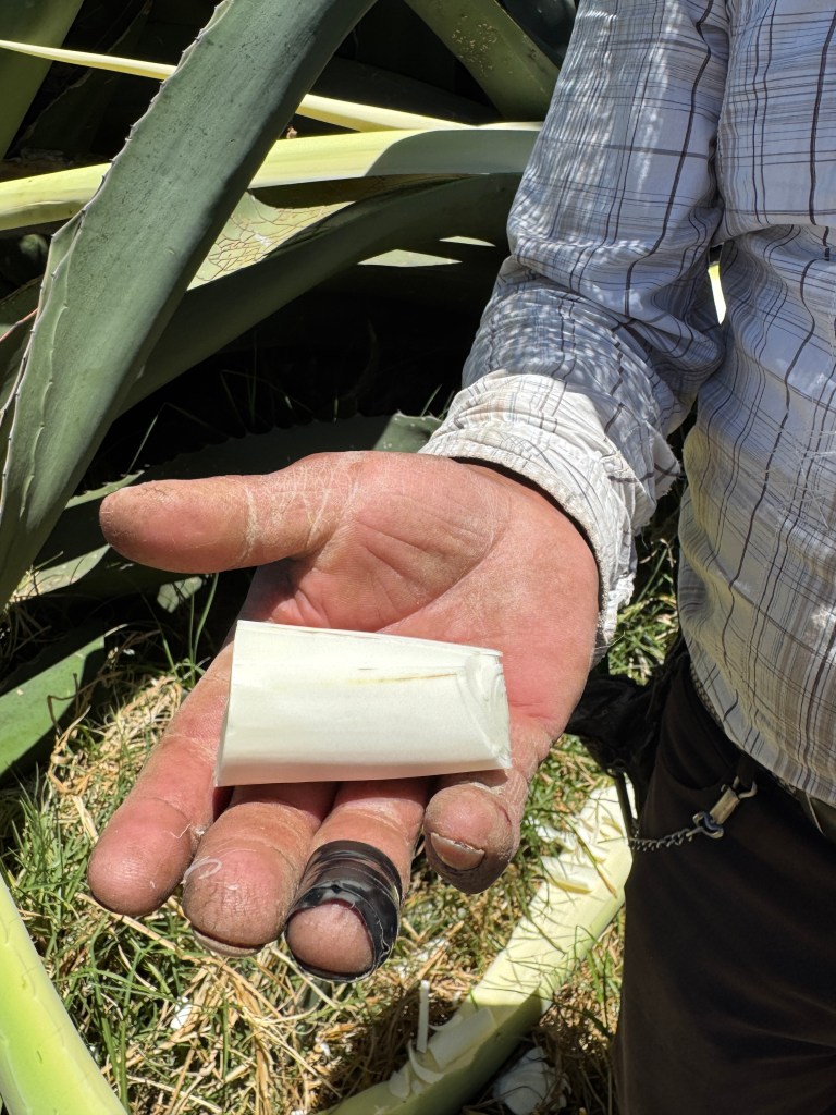 - El capado y apertura: El quiote se corta y deja a la planta desprovista de otro medio de reproducción más que el de la auto clonación. En sintonía con Dehouve (2014) que se refiera a este periodo como el de la “apertura de la muchacha”, el tlachiquero limpia las pencas de manera sutil para descubrir el centro, marcarlo y reposar por un par de semanas para su posterior apertura o ahuecado. Este proceso puede durar alrededor de dos a cuatro semanas -siempre que la luna llena sea favorable- en el que el maguey abrirá su corazón para ofrecer su vital líquido: el aguamiel. Para este proceso se requiere experiencia, tacto, conocimiento empírico, herramientas listas, y total concentración, dice Moreno (2025), de lo contrario la planta puede estropearse, pudrirse por dentro o secarse sin tener rendimiento de aguamiel y perder su principal motivo de existencia.