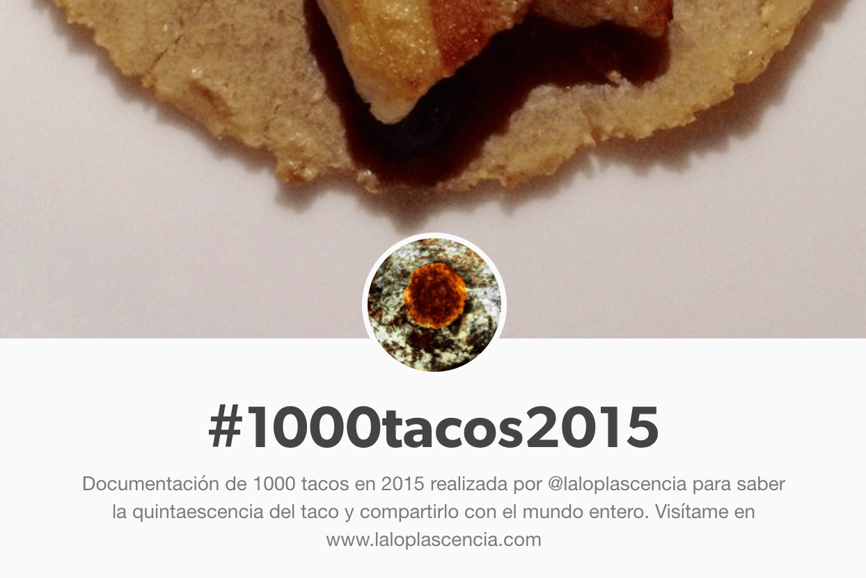 en 2015 para difundir información de forma sostenible, accesible y para generar mayor pensamiento sobre uno de los temas con mayor relevancia histórica, cultural y gastronómica de México: los tacos. Este proyecto es fiel a mi filosofía en la que compartir conocimiento genera felicidad, por eso hasta el 31 de diciembre de 2017 fue una plataforma abierta con información disponible en www.1000tacos2015.com en la que se reveló la mayor acumulación de información sobre tacos de la historia de la cocina mexicana.